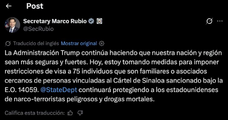 A través de su redes sociales, Marco Rubio, secretario del Departamento de Estado de los Estados Unidos, informó que se impondrán restricciones de visa a 75 personas que son familiares o asociados cercanos de individuos previamente sancionados por sus vínculos con esta organización criminal. La acción se sustenta en la Orden Ejecutiva Executive Order 14059, un instrumento legal que permite sancionar a actores involucrados en el tráfico internacional de drogas.